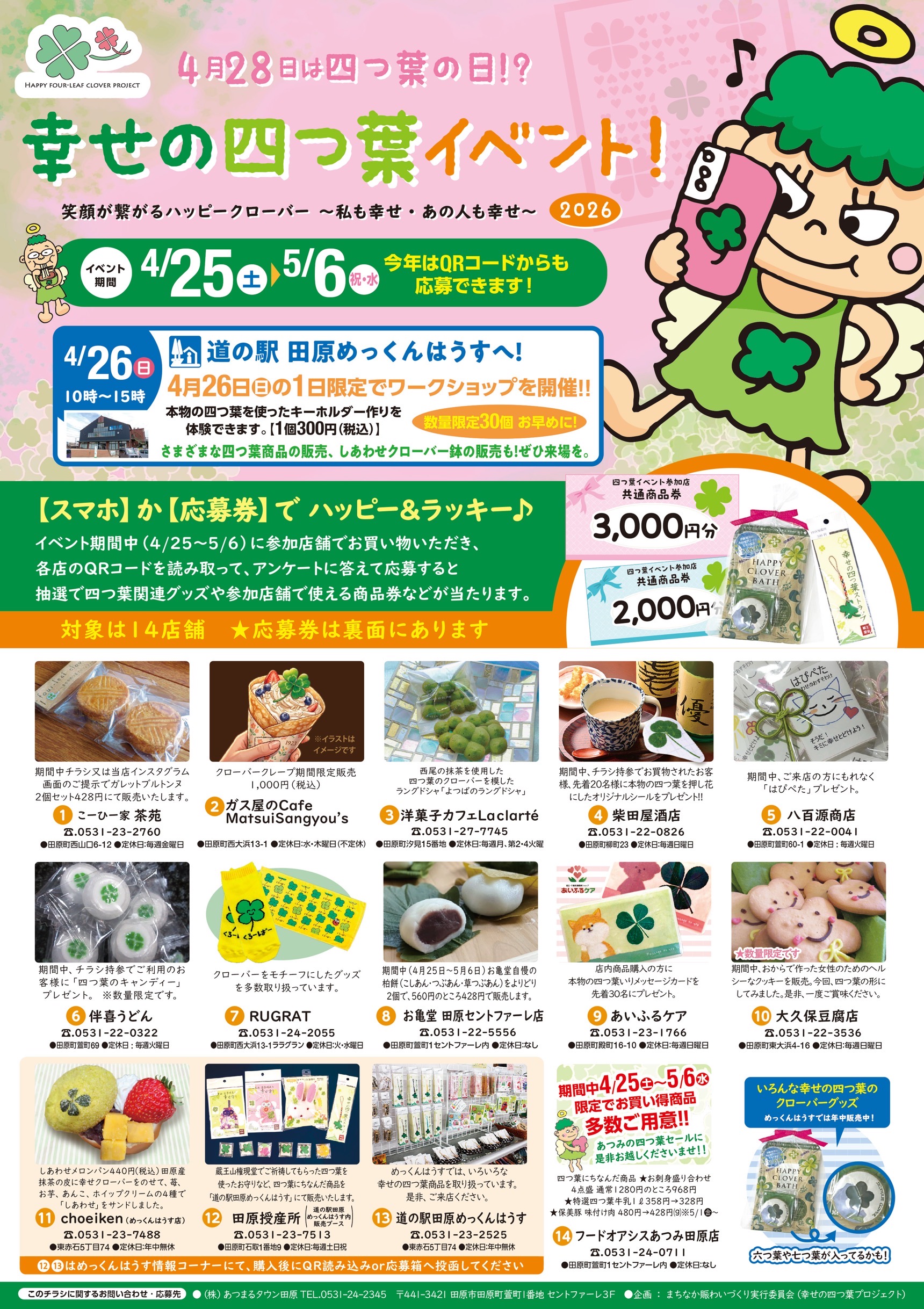 ●内容 :イベント期間中(4/25~5/6)に参加店舗でお買物いただき、各店のQRコードを読み取って、アンケートに答えて応募すると抽選で四つ葉関連グッズや参加店舗で使える商品券などが当たります。幸せの四つ葉イベントチラシの応募券からも参加できます。